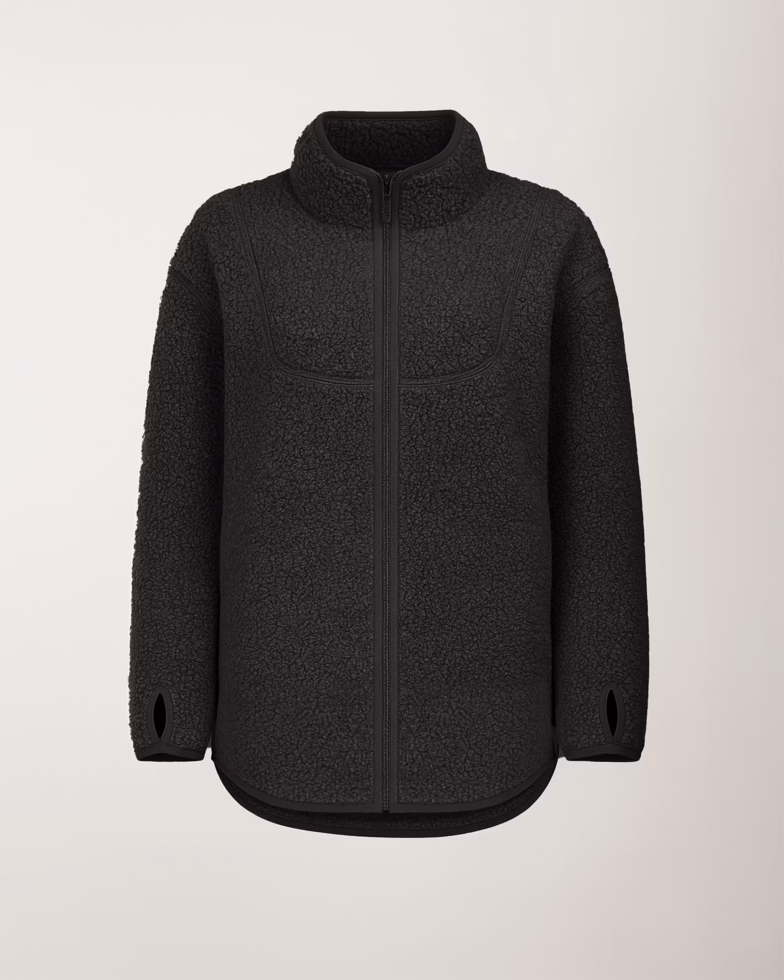 Lång jacka i mjuk teddy-pile med hög krage, hellång dragkedja och praktiska fickor. Perfekt för kyliga dagar.